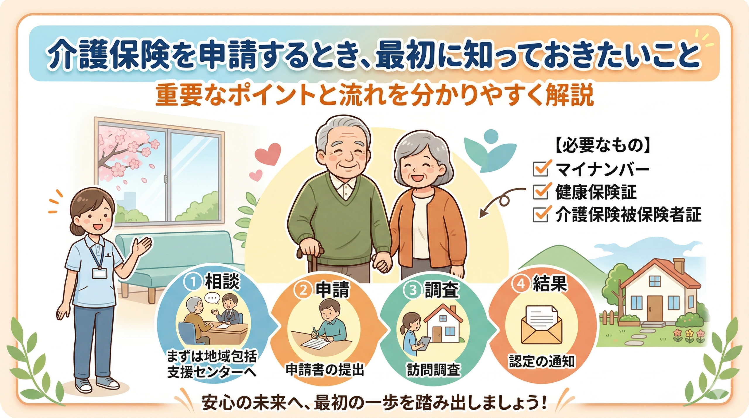 介護保険の申請は「地域包括支援センターに介護保険証を持参」するだけで始められます。申請にお金はかからず、スタッフが丁寧に対応してくれます。認定調査への立ち会いと、かかりつけ医への事前連絡を忘れずに行うことが、スムーズな認定につながる大切なポイントです。