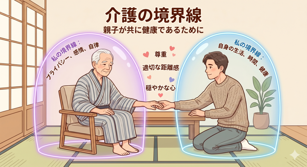 境界線と聞くと冷たく聞こえるかもしれませんが、実はその逆。無理なく続けるための工夫であり、親との関係を長く温かく保つために欠かせない考え方です。ここでは、私自身の体験を交えながら、介護における「ちょうどいい距離」の取り方をお話します。